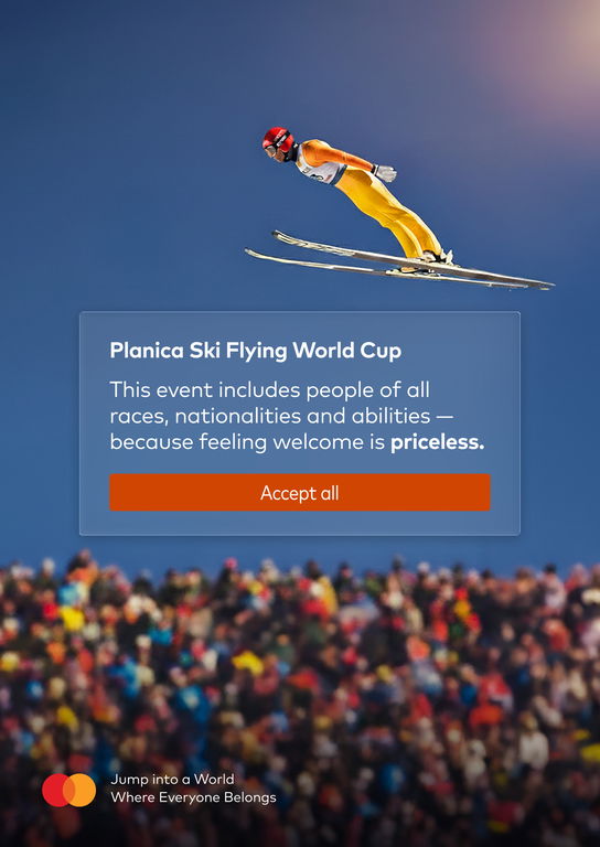 The digital world has trained us to mindlessly click “accept all” in order to move forward. It is a small but familiar gesture that we hardly think about anymore. Yet in the real world, full of people with different backgrounds, identities, and abilities, accepting everyone around us is also the way to move forward as a society. This insight became the foundation of our creative concept. That is why we decided to reimagine a well-known digital action as an inspiring metaphor for inclusion, using the instantly recognizable “cookie consent” popup as our creative device. Our visual mimics a popup placed over the most thrilling moment of the Planica Ski Flying World Cup, where a jumper is captured in full flight above a cheering crowd. Instead of generic data and privacy terms, the banner highlights different groups of people — all of them belonging in Planica. At the bottom, the familiar button appears: Accept all. With this simple twist, a routine digital gesture is transformed into a universal call for acceptance — of everyone, from everyone — giving our digitally connected audience of young, socially conscious individuals the power to lead with purpose. By merging the immediacy of digital culture with the emotional spirit of sport, the concept turns something ordinary into something meaningful. It frames Mastercard as the brand that transforms a technical phrase into a human promise: Jump into a World Where Everyone Belongs. At the same time, it positions Planica not just as a breathtaking competition, but as a modern sporting event where energy is shared and all fans feel valued — no matter who they are, where they come from, or what their abilities might be. Because in this world, being accepted is priceless.