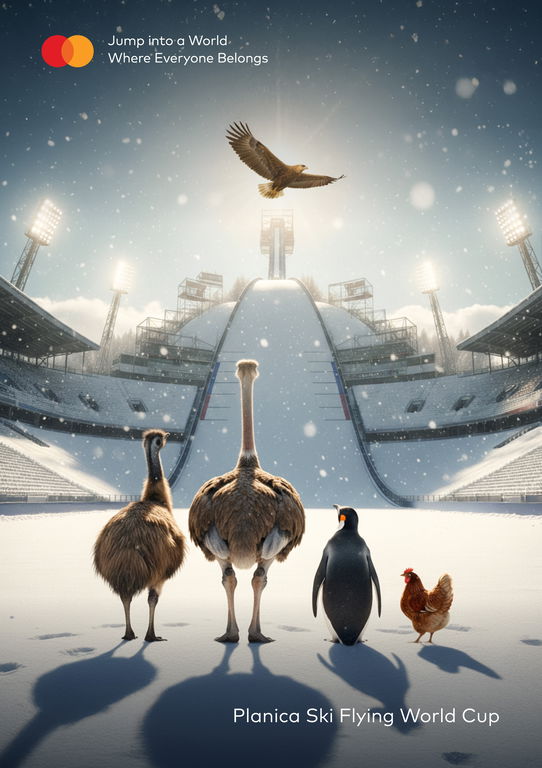 Flying has always been a symbol of freedom and limitless possibilities. And when we think of flying, birds are probably the first image that comes to mind. Yet in the real world, not all birds can fly. But does that make them any less of a bird? Does that mean they don't belong among the others? Of course not. And if that truth applies to nature, why shouldn't it also apply to us – human beings living in a world of incredible diversity? Even though people come from different backgrounds, experiences, and abilities, we are all human beings — and we are all welcome in Planica, that extraordinary event of the Ski Flying World Cup. This insight inspired a striking visual metaphor that makes inclusion both universal and deeply emotional. Our poster shows different flightless birds — an ostrich, an emu, a penguin, and a hen — standing proudly at the base of the iconic ski jump in Planica. Above them, a soaring eagle rises toward the sky, symbolizing freedom and possibility. Together, they reflect all the differences that exist among us, all the ways in which we may appear unlike one another. But what unites them, however, is their shared energy, spirit, and presence in Planica — a place where everyone truly belongs. The image delivers a simple but powerful message: belonging is not defined by what you can or cannot do, but by the community that surrounds and supports you. That way Planica is recognised as much more than just a sporting event — it is a celebration of diversity, unity, and joy, and a living expression of Mastercard’s core values. What a perfect time and place to Jump into a World Where Everyone Belongs.