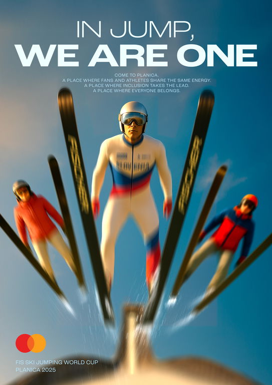 Based on the client’s brief, we set out to translate Mastercard’s key values – inclusivity, sustainability, and accessibility – into a visual that feels clean, modern, and heroic. The goal was not only to create another campaign image, but to craft communication that reflects the spirit of the brand and resonates on an emotional and visual level. We chose the metaphor of ski jumping, a sport that embodies courage, precision, and the moment when one leaves the ground and takes flight toward a shared goal. Beyond technique, it symbolizes bravery, aspiration, and the beauty of defying gravity. By focusing on the instant when the jumper is airborne, suspended between earth and sky, we capture pure determination and possibility. To highlight diversity, we expanded the metaphor beyond the professional athlete. The campaign shows not only trained ski jumpers, but also ordinary people and fans in the same iconic pose. They too become participants in the leap, equal in passion, energy, and belonging. This transformation of a heroic sporting gesture into a shared human experience is the essence of the idea. This creates a visual where athletic heroism blends with humanity and inclusivity. Each individual – regardless of age, gender, or background – becomes part of the flight. Warm golden light makes the scene both dreamy and optimistic, striking a balance between extraordinary and achievable. The symbolism of flight becomes a metaphor for unity: in the air, everyone is equal – connected by the same experience and direction. Mastercard is positioned not simply as a sponsor of sport, but as the enabler of shared human moments and underlines our idea: In Jump, We Are One. The result is a clean, powerful, and iconic visual that communicates Mastercard’s values in a way that is emotional, inclusive, and memorable. It shows that Mastercard does more than enable transactions – it enables belonging, togetherness, and progress.