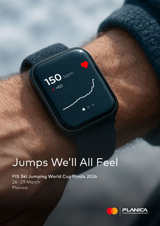 While ski jumps at the championship will be performed only by top athletes, there are also jumps that every single visitor will feel in their own body at the same time — the jumps of the heart rate rising upwards. After all, throughout the competition there will be no shortage of thrilling, breathtaking moments. These heart rate jumps are visualized through a visitor’s smartwatch, a modern accessory that has become an everyday part of life for millions of people. By showing a sharp increase in heart rate on the display, typical of extraordinarily exciting sports moments, the visual captures something universal that everyone can relate to. It is not only a creative metaphor for adrenaline and emotion but also a natural reflection of Mastercard’s close connection to modern technologies. Excitement and joy are, after all, the emotions that sport brings to people everywhere and that have the power to unite us all. In an original and engaging way, the poster invites fans to come and experience these emotions in person at the FIS Ski Jumping World Championship in Planica in March 2026. The design itself combines creativity with technology: the visual was developed using artificial intelligence in combination with Adobe Photoshop. This approach allows for a fresh and contemporary look, while still keeping the design fully consistent with Mastercard’s brand identity. The poster format is practical A3, making it easily adaptable for various promotional purposes. In the bottom right corner, the partnership between Mastercard and the Planica FIS Ski Flying World Championship is clearly conveyed by placing both logos side by side, ensuring a balanced composition and a professional, cohesive look.