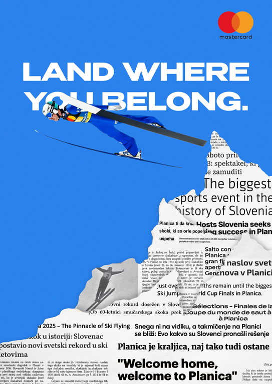 The main character of the poster is a ski jumper, soaring gracefully over the mountains that define Planica. He is not just an athlete in flight, he is a symbol of Planica itself and a reflection of everyone who can identify with the spirit of this extraordinary place. The mountains beneath him are made of real newspaper articles - stories from the world around us, often harsh, critical, and overwhelming. Normally, we encounter these stories as reminders of challenges and struggles, but here, they transform into a narrative that celebrates connection, inspiration, and the power of shared experiences. When the focus turns to Planica, the articles tell a different story - one of a place that transcends generations, a place where people of all ages come together and feel a genuine sense of belonging. This is precisely what the slogan “Land where you belong” conveys. It functions on multiple levels: literally, it invites every individual, in their own journey, whether in sport, work, or life - to land safely in a place where they feel at home. Figuratively, it speaks to the universal desire to find a space where one’s presence is valued and celebrated. Planica, in this sense, becomes more than a ski jumping venue; it is a symbol of community, connection, and continuity. The poster captures this essence visually and narratively, transforming the harshness of the outside world into a backdrop for a story about unity, excitement, and inclusion. Through the combination of dynamic imagery, authentic storytelling, and a slogan that plays with words, the poster communicates the heart of Planica: a destination that inspires, welcomes, and reminds us that everyone has a place where they truly belong.