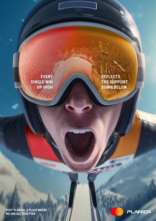 Insight Fans and spectators at live events can push athletes to deliver better performances. However, the cameras only capture the athlete. Yet the fans deserve the same attention. Idea So we turned the perspective around. Through the eyes of the ski jumper, we placed the focus on the audience. Because the most valuable view for an athlete is not the finish line, but the fans who carry him through every moment of the jump. They are the true source of energy that transforms performance into victory. Execution Our key visual captures a close-up of a ski jumper mid-flight. Reflected in his goggles is a crowd of fans – cheering, clapping, and fueling his performance. The reflection symbolizes that the audience is never out of sight, but always an inseparable part of his success. To integrate Mastercard’s sponsorship directly into the design, the lenses of the goggles were created in the signature tones of the Mastercard logo, reinforced with the brand itself. The visual works seamlessly both offline and online – as an invitation to the event, as well as an on-site element amplifying the spirit of cheering. Impact The campaign doesn’t just communicate Mastercard’s sponsorship – it celebrates the fans as the true driving force of victory. By shifting the spotlight from the athlete to the people in the stands, Mastercard gave everyone the feeling that they are not just spectators, but an essential part of every win. It turned cheering into a symbol of unity, where every clap and shout becomes part of the triumph itself.