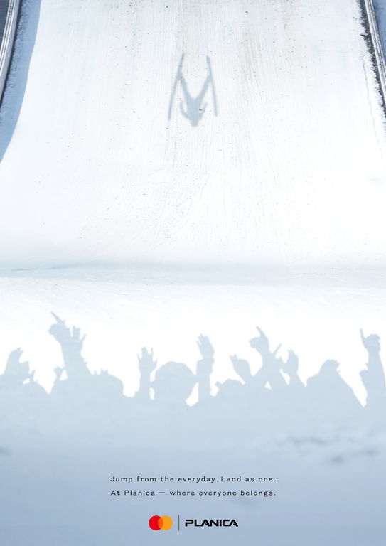 Have you ever been to a sports event, music festival, or cultural celebration where you suddenly became friends with strangers? At the very least, you may have felt a bond with the people around you because you shared the same energy and excitement in that moment. We believe the same is true for the Ski Jumping World Cup in Planica. To show that this competition is more than just a sports event and that everyone is welcome, our core idea is to capture the moment when this sense of togetherness is born. So, when does this moment occur? It happens when an athlete, with courage and risk, launches into the air, and the crowd unites to cheer him on. In that instant, there are no borders, no differences of race, religion, sexuality, or disability. What remains is pure respect and a collective hope for success. The athlete himself also becomes part of that shared emotion. This poster visualizes that moment of unity through the motif of shadows cast on the snow. Every shadow, whether from athletes or spectators, is the same color. People from different walks of life come together in one place, share one single emotion, and symbolically become one color. For this reason, the tagline is: 'Jump from the everyday. Land as one.” The composition naturally guides the viewer's eye from the shadow of the ski jumper to the silhouettes of the crowd and finally toward the tagline and logos. Through this iconic expression, the poster invites young audiences not merely as 'spectators' but as 'participants' in the priceless experience of belonging.