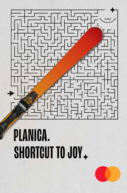 Life is a maze. Especially if you are on the constant lookout for joy. But (and it’s a big but, like a mountain) it doesn't have to be that way. We are all looking for shortcuts in our everyday life through experiences, and we believe that the Ski Jumping World Cup in Planica is definitely one of those shortcuts. Nothing beats the joy of coming together with your friends and family to cheer. The joy you feel when you are connected to the living and breathing group of sports fans. The joy of seeing professionals do such insanely impressive things with their skis. Or the joy of just being in a beautiful nature environment surrounded by the Slovenian mountains. What do these things have in common? They are right here, in Planica. Open to everyone and anyone. You are welcomed. No matter if you were born with skis on your feet or you haven't tried it yet. What language you speak. Or if you love or hate Labubus. The ski on our poster is calling your name and invites you to take this joyride alongside with the professional ski jumpers coming from around the world. Our ski represents all of these spirited forms of joy. With its realistic features it disrupts the children’s workbook aesthetic we set up with the maze. That ski can belong to you, or a professional. Anyone's game, just like Mastercard. Pointing upwards, symbolizing the jump. Just stomping over the maze of life, towards joy. We encourage you to jump into a world where everyone belongs: come to Planica, because it is the shortcut to joy.