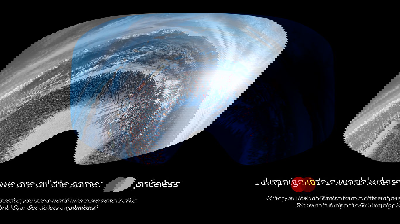 From the sky jumper's point of view at Planica, some angles reveal instances when everybody seems the same. The crowd at the Ski Jumping World Cup looks so small from that perspective, you can hardly see any significant differences between individuals. Our goal is to invite people to jump into a world where everybody is the same and show them that everyone can celebrate ski jumping, regardless of their differences. How can Mastercard Slovenia, a brand that plays a major role in the inclusive aspect of Planica, show them that? Introducing: The Inclusive POV. Through this idea, we are using the ski jumper’s point of view in order to communicate that everyone is equal and welcome at the Ski Jumping World Cup in Planica. The idea’s objective is to show Planica during the Ski Jumping World Cup as a place tailored to inclusivity. This is achieved by using the point of view of a ski jumper to dramatize what it's like to jump into Mastercard’s inclusive world. Their perspective helps us visually illustrate not just the feeling of jumping into this world, but also what's priceless at the event: a shared sense of equality among the participants. From the heights that the ski jumper reaches, differences are hard to notice, giving us the opportunity to enhance the presence of inclusivity at the event. Looking at Planica from these kinds of heights also helps us portray it as a world in a literal sense, not just a metaphorical one. The message taps directly into the topic 'Jump into a world where everybody belongs' through a priceless line that invites anyone to the event in Planica.