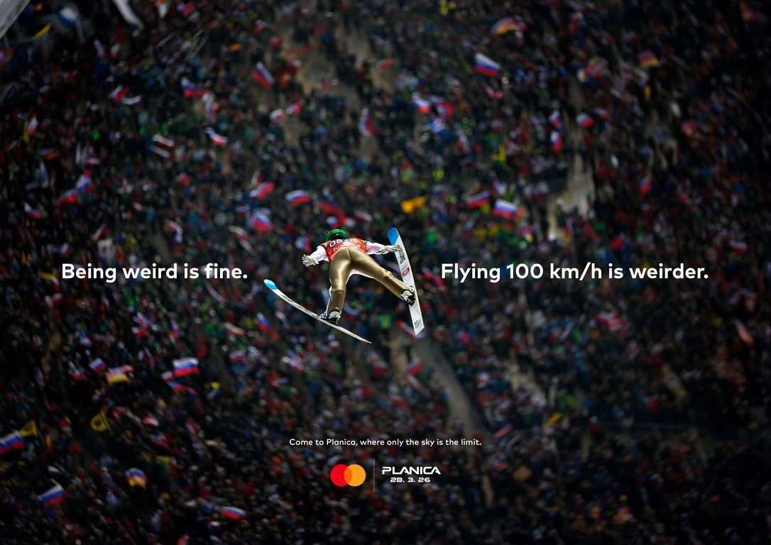 Ski flying in Planica is one of the strangest, most extraordinary sports in the world. Humans dressed in slim aerodynamic suits launch themselves down a ramp, accelerate to 100 km/h, fly through the sky for more than 250 metres, and—most of the time—land safely on their feet. It makes little rational sense: no protective cage, no engine, no wings. Just human courage, gravity, and the belief that limits can be pushed. It’s absurd. It’s weird. And yet it is celebrated by tens of thousands of people every March, turning a small valley in Slovenia into a global festival of flight. That absurdity is exactly why this idea works. Because many people feel “weird” in their everyday lives—because of a disability, a difference, or simply not fitting into expectations. For them, the world can feel like it wasn’t built for their shape. But when we pair the surreal nature of ski flying with the universal feeling of being different, we flip the perspective: in Planica, weirdness is not something to hide. It is normal. It is the reason the crowd gathers. It is what makes the experience Priceless. Our poster takes this paradox and turns it into an invitation. It calls on everyone—especially those who often feel out of place—to join a celebration where belonging is defined not by blending in, but by embracing what makes us unique. Planica proves that the impossible can be made routine and the strange can be beautiful. And because in Planica humans literally break the limits of physics, the message becomes clear: Sky is the limit—for all of us.