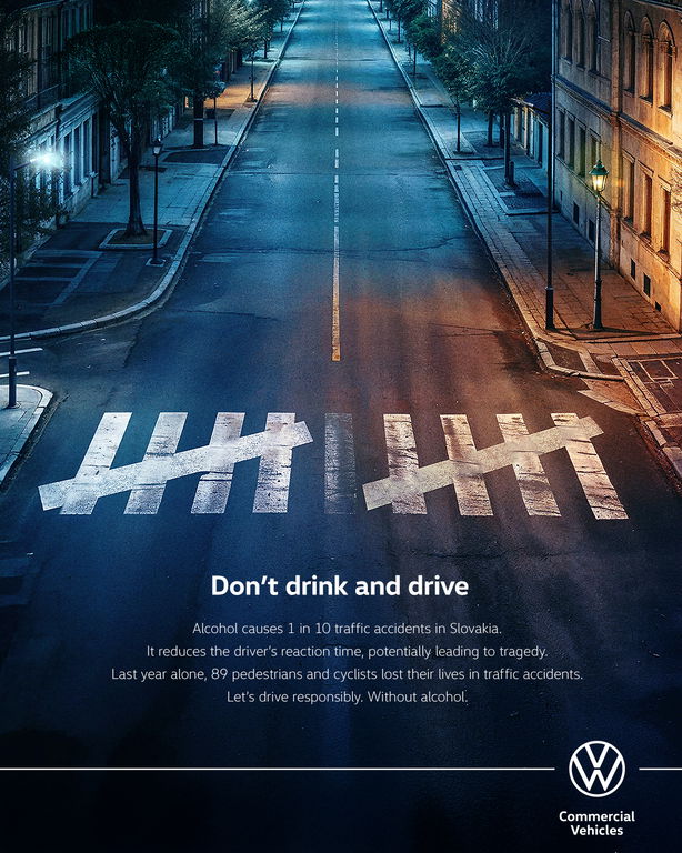 Alcohol-related traffic accidents remain alarmingly high in Slovakia. Using a pedestrian crossing–like symbol of consumed drinks, we highlighted the fact that every tenth accident is caused by alcohol.