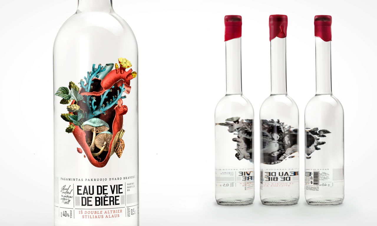 “PAKRUOJO EAU DE VIE DE BIERE” was distilled at the Pakruojo Manor, an estate dating back to the Middle Ages. This unique spirit combines the magic of two crafts: vodka making and beer making. The real story of a pharmacist who lived and worked at the manor in the XIXth century inspired an anatomical design style and dictated antique alchemist-book illustrations. Vibrant colors, an elegant bottle shape, and the subtle proportions of all elements resulted in a surrealistic and mysterious design.